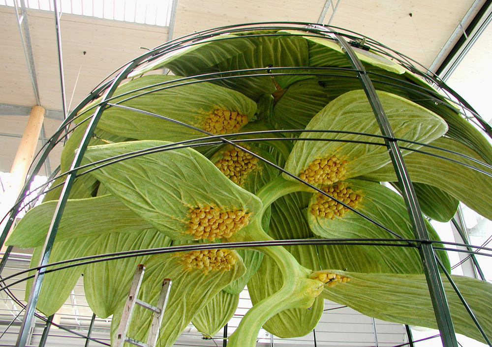 Dass die Begehbare Dolde zur Museumseröffnung 2005 tatsächlich bestaunt werden konnte, war sicher einer der wenigen positiven Nebeneffekte der extrem langen Planungszeit des Museums, die ja bekanntlich 21 Jahre in Anspruch nahm. Über Jahre hin gab es immer wieder neue Anläufe, die Dolde zu realisieren, gab es veränderte Planungen, bemühten sich verschiedene Künstler, Firmen, kreative Menschen um eine Lösung. Der Mann, der es dann letztendlich auf den Punkt brachte, hieß Politor, Günther Politor. Seine Firma namens Werk 7 brachte nicht nur viel Erfahrung beim Bau von Kulissen aller Art mit, sei es bei Theater, Film oder Museen. Er bot das Ganze auch zu einem Preis an, der mit unserem schmalen Budget zu stemmen war. Wir sind ihm und Werk 7 heute noch dankbar dafür.