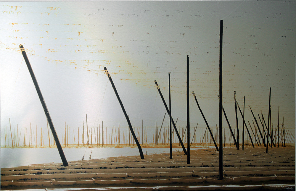 Besonders hat mich die Winterstimmung angesprochen, bei der durch die vielen diagonalen und vertikalen Hopfenstangen ,die zu tausenden der Landschaft auf sanften Hügeln entwachsen, eine unglaubliche, grafische Dynamik und Bewegung entsteht, die den Raum greifbar und fühlbar macht. Der weiße Schnee in den Furchen bildet den spannenden Kontrast und die Gegenbewegung zu den dunklen Stangen.