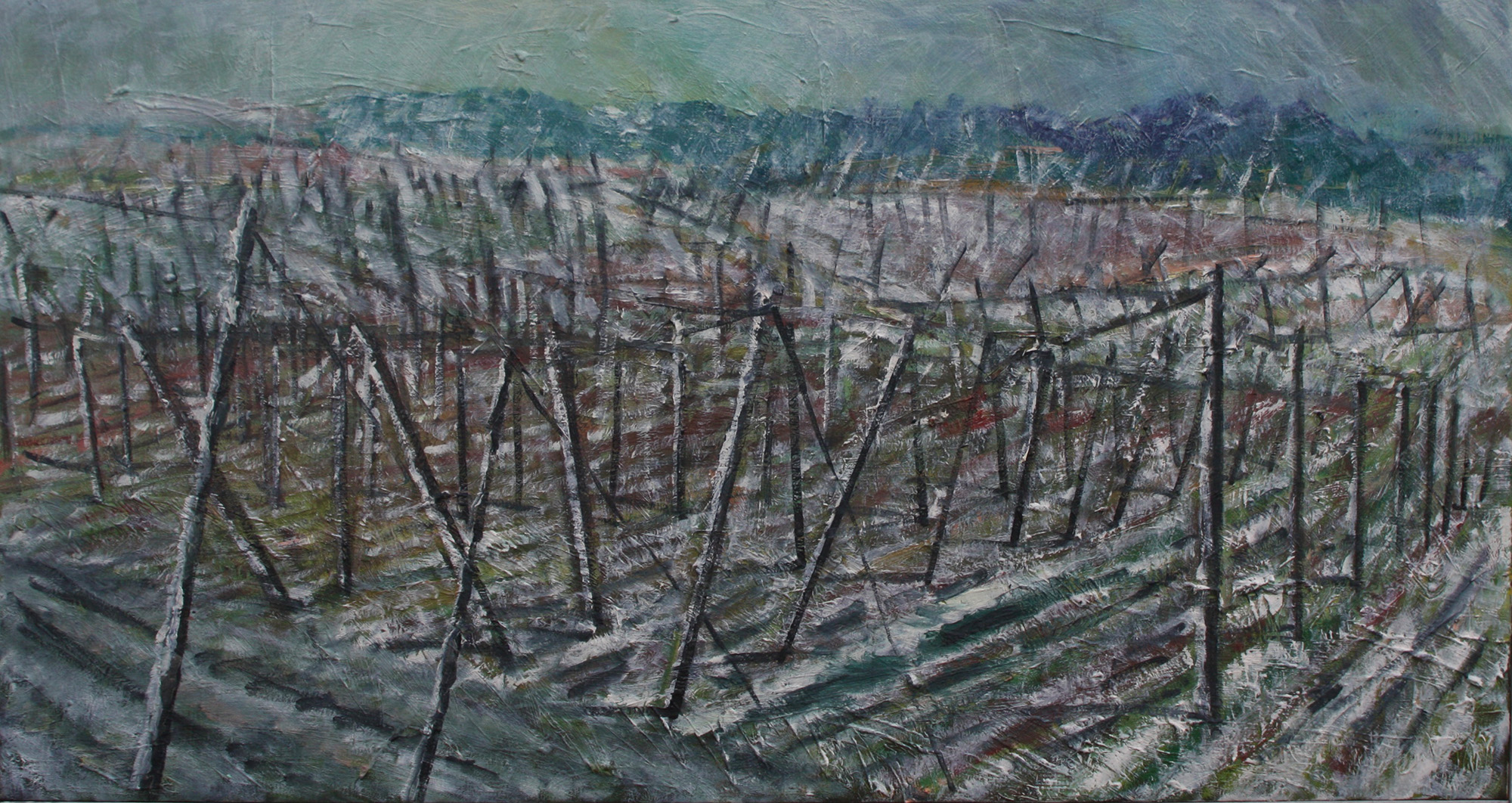 Besonders hat mich die Winterstimmung angesprochen, bei der durch die vielen diagonalen und vertikalen Hopfenstangen ,die zu tausenden der Landschaft auf sanften Hügeln entwachsen, eine unglaubliche, grafische Dynamik und Bewegung entsteht, die den Raum greifbar und fühlbar macht. Der weiße Schnee in den Furchen bildet den spannenden Kontrast und die Gegenbewegung zu den dunklen Stangen.
